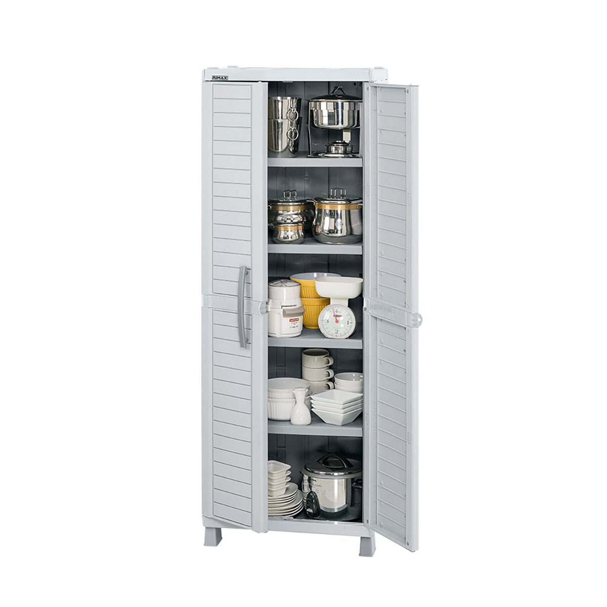 | Características | Armario Grande con 4 entrepaños ajustables que resisten hasta 25 Kg cada uno. Fácil de armar, mover y limpiar. Con la resistencia y beneficios del plástico. Excelente capacidad interior, con orificio para uso del candado para mayor seguridad. De apariencia moderna y elegante. Ideal para interiores y exteriores. |