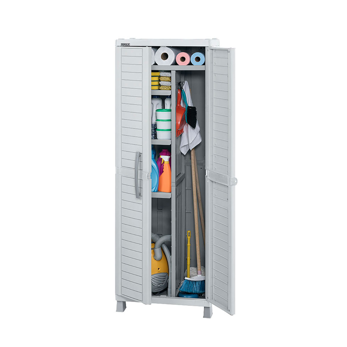 | Características | Armario Multiusos, con 3 entrepaños ajustables que resisten hasta 25 Kg cada uno y división central que permite almacenar de la mejor forma los elementos de aseo del hogar . Fácil de armar, mover y limpiar. Con la resistencia y beneficios del plástico. Excelente capacidad interior, con orificio para uso de candado para mayor seguridad. De apariencia moderna y elegante. Ideal para interiores y exteriores. |