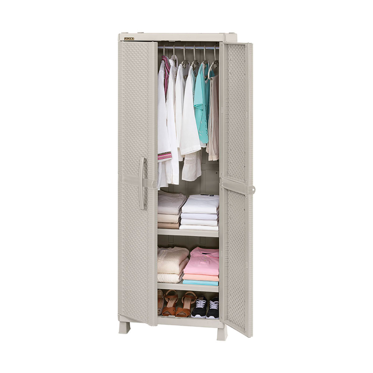 | Características | Armario para Ropa con 2 entrepaños ajustables que resisten hasta 25 Kg cada uno, tubo en aluminio para colgar la ropa, con la profundidad ideal para colgar cómodamente cada prenda e incluye 6 ganchos RIMAX. Fácil de armar, mover y limpiar. Con la resistencia y beneficios del plástico. Excelente capacidad interior, con orificio para uso candado para mayor seguridad. De apariencia moderna y elegante. Ideal para interiores y exteriores. |