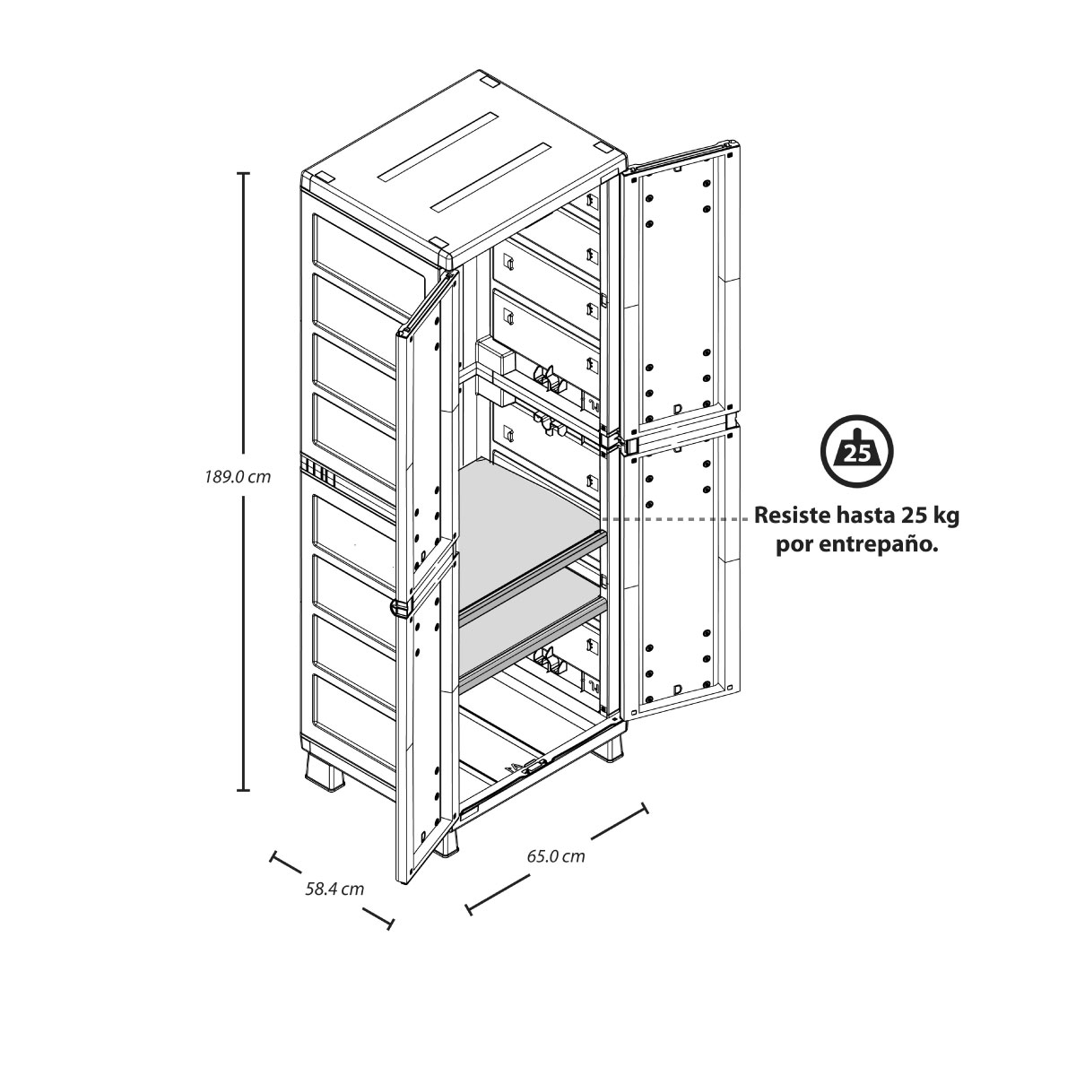 | Características | Armario para Ropa con 2 entrepaños ajustables que resisten hasta 25 Kg cada uno, tubo en aluminio para colgar la ropa, con la profundidad ideal para colgar cómodamente cada prenda e incluye 6 ganchos RIMAX. Fácil de armar, mover y limpiar. Con la resistencia y beneficios del plástico. Excelente capacidad interior, con orificio para uso candado para mayor seguridad. De apariencia moderna y elegante. Ideal para interiores y exteriores. |