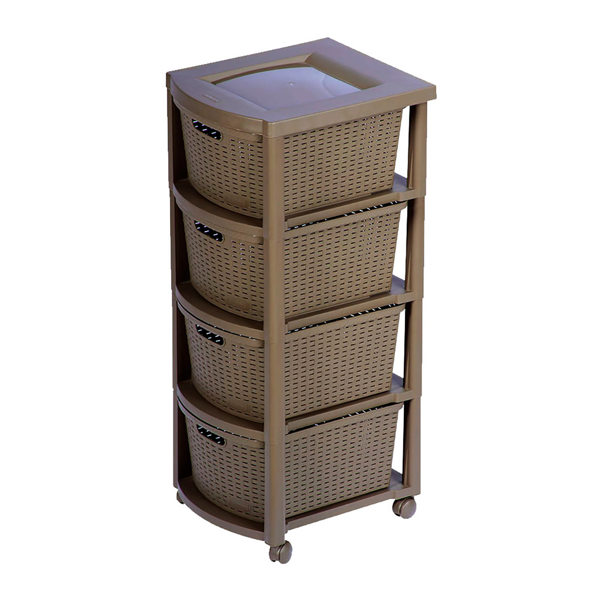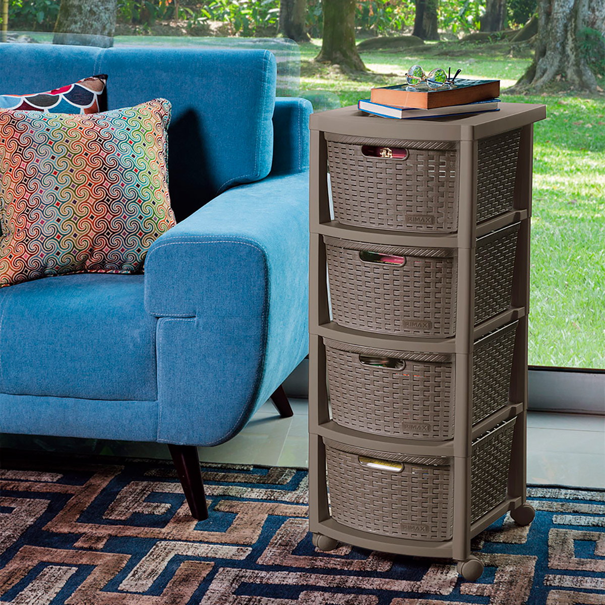 | Características | Cajonero con apariencia Rattán con 4 gavetas, las canastas cuentan con una capacidad de 12 Litros. Las canastas se pueden retirar completamente y mover fácilmente gracias a las manijas en sus dos extremos. Completamente plástico y con rodachinas que permiten mover lo con facilidad. ¡Apariencia renovada y colores para los hogares de hoy! |