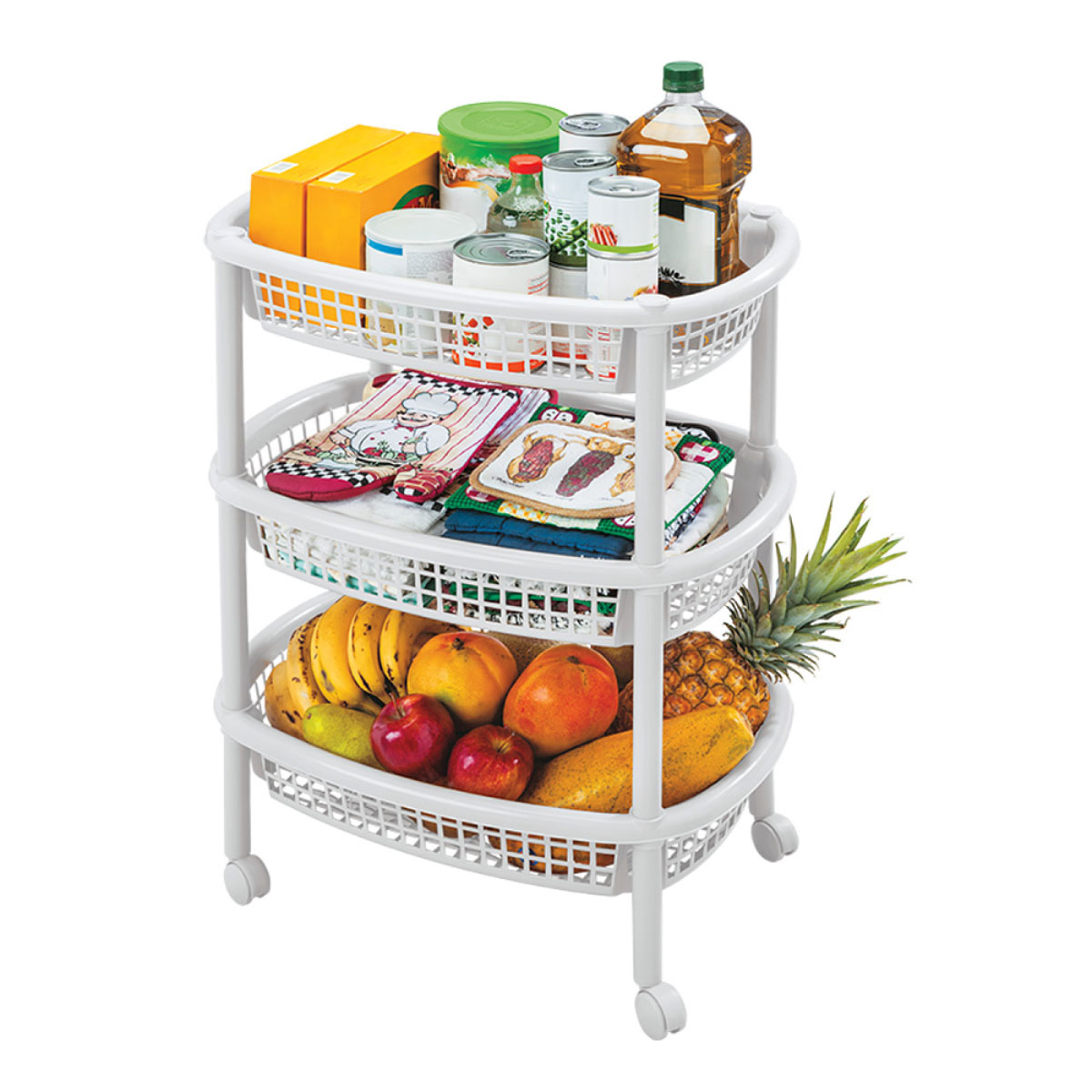 | Características | Canasta móvil ovalada que incluye tres niveles para organizar. Tiene rodachinas. Fácil de armar, no requiere herramientas. Ideal para organizar en casa todo tipo de objetos. No se oxida y es fácil de limpiar. Úsala en cocina, baños, cuartos de niños, como organizador auxiliar. Es tejida y permite oxigenar los productos o alimentos que guarde. |