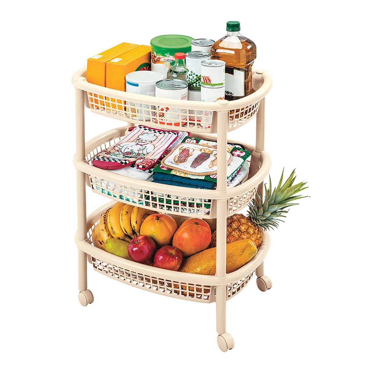 | Características | Canasta móvil ovalada que incluye tres niveles para organizar. Tiene rodachinas. Fácil de armar, no requiere herramientas. Ideal para organizar en casa todo tipo de objetos. No se oxida y es fácil de limpiar. Úsala en cocina, baños, cuartos de niños, como organizador auxiliar. Es tejida y permite oxigenar los productos o alimentos que guarde. |