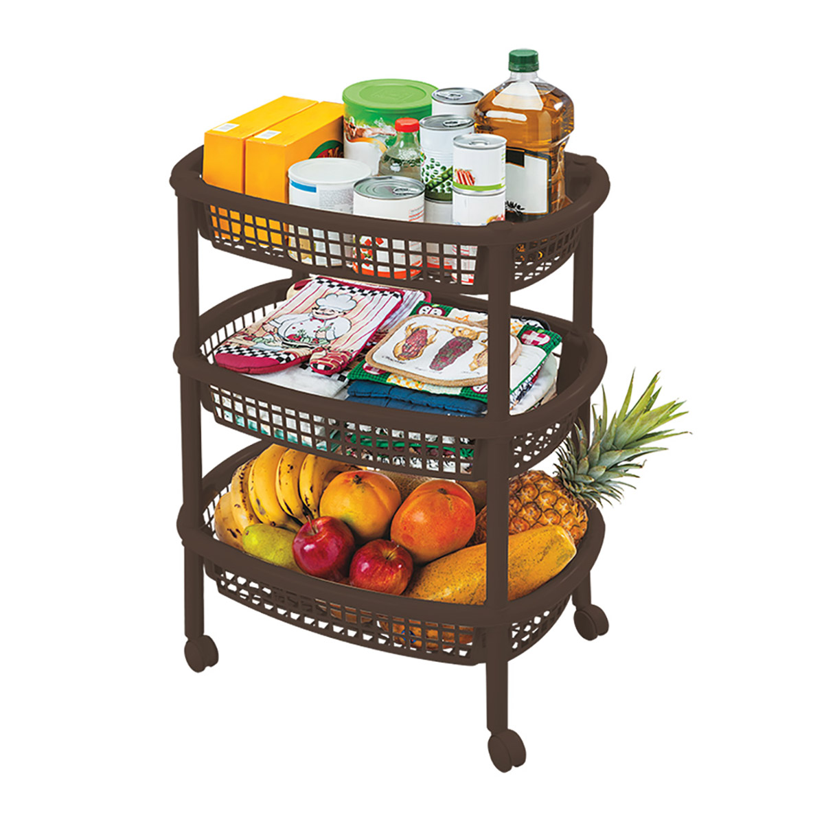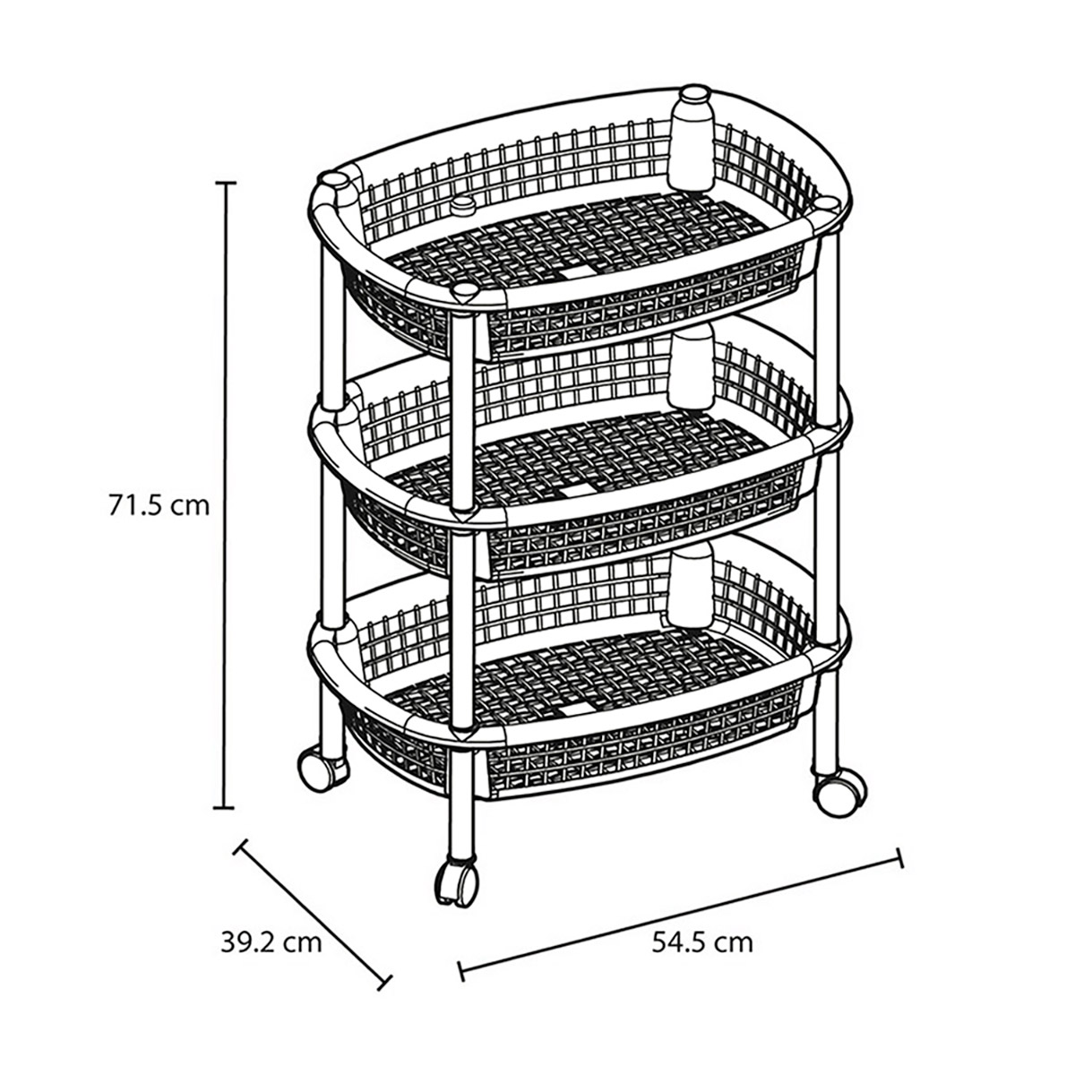 | Características | Canasta móvil ovalada que incluye tres niveles para organizar. Tiene rodachinas. Fácil de armar, no requiere herramientas. Ideal para organizar en casa todo tipo de objetos. No se oxida y es fácil de limpiar. Úsala en cocina, baños, cuartos de niños, como organizador auxiliar. Es tejida y permite oxigenar los productos o alimentos que guarde. |