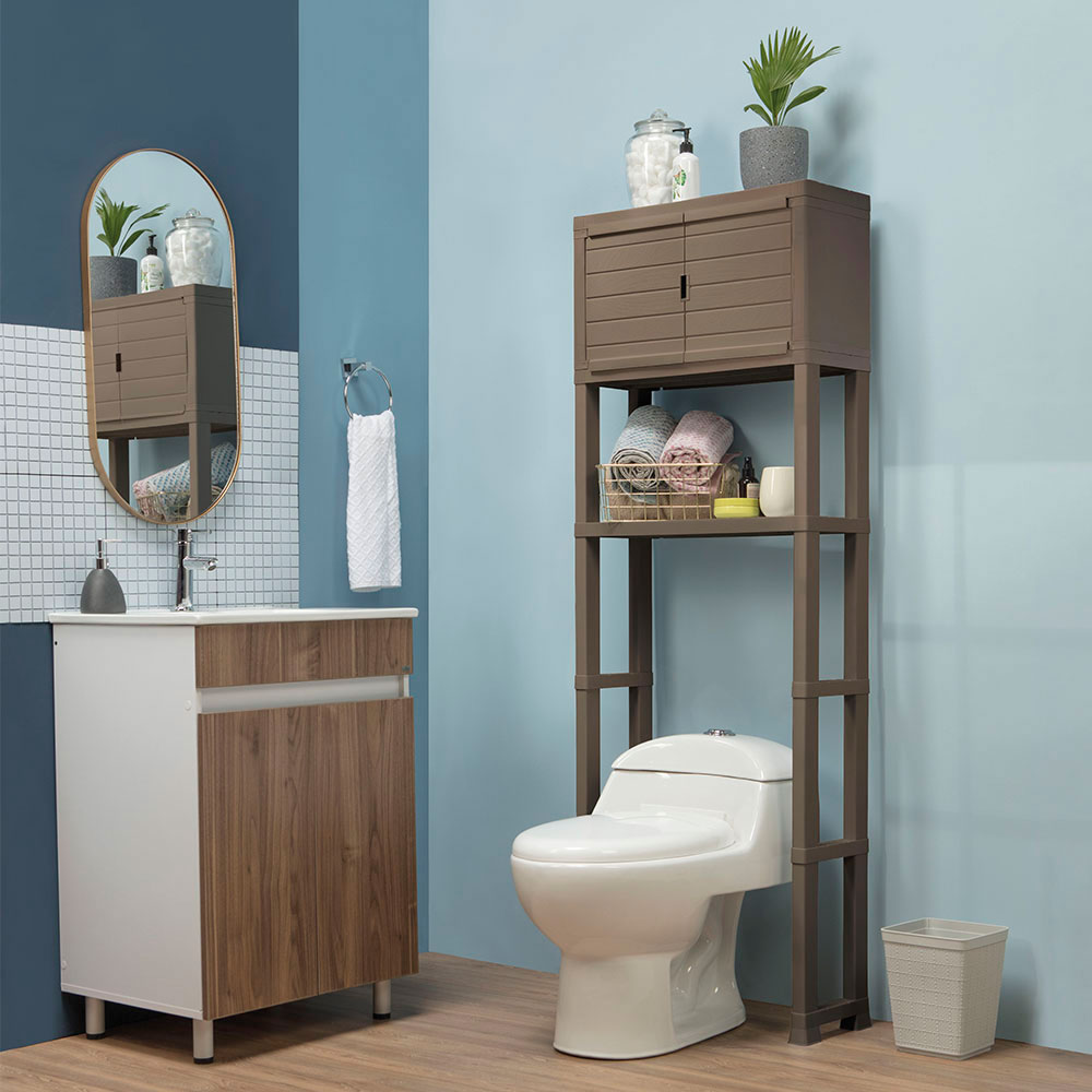 | Características | Estante Organizador con Puertas para Baño, con amplio gabinete superior de puertas abatibles, y entrepaño inferior y superior ideales para organizar los elementos del baño, con una resistencia hasta 10 kg por entrepaño. Su textura imitación madera, elegante y acogedora le da el toque especial a tus espacios. |