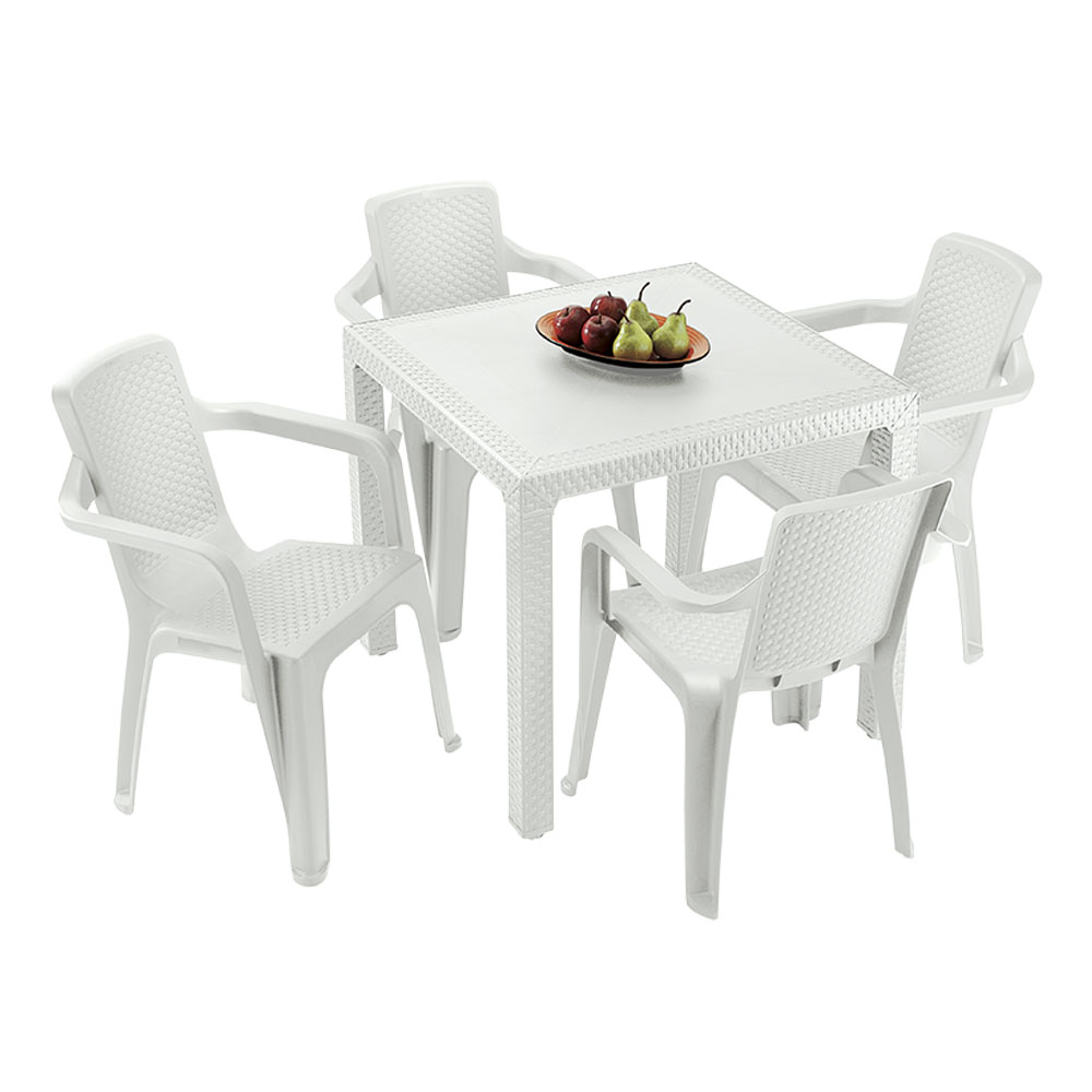 | Características | Mesa Cuadrada de 80cms y 70 Cms de altura; ideal para uso como comedor para 4 puestos. Patas cuadradas , que brindan elegancia y una línea de diseño única. De apariencia Rattan y colores clásicos y elegantes; ideal para usos interiores o exteriores, práctica, fácil de limpiar y con todos los beneficios del plástico. |