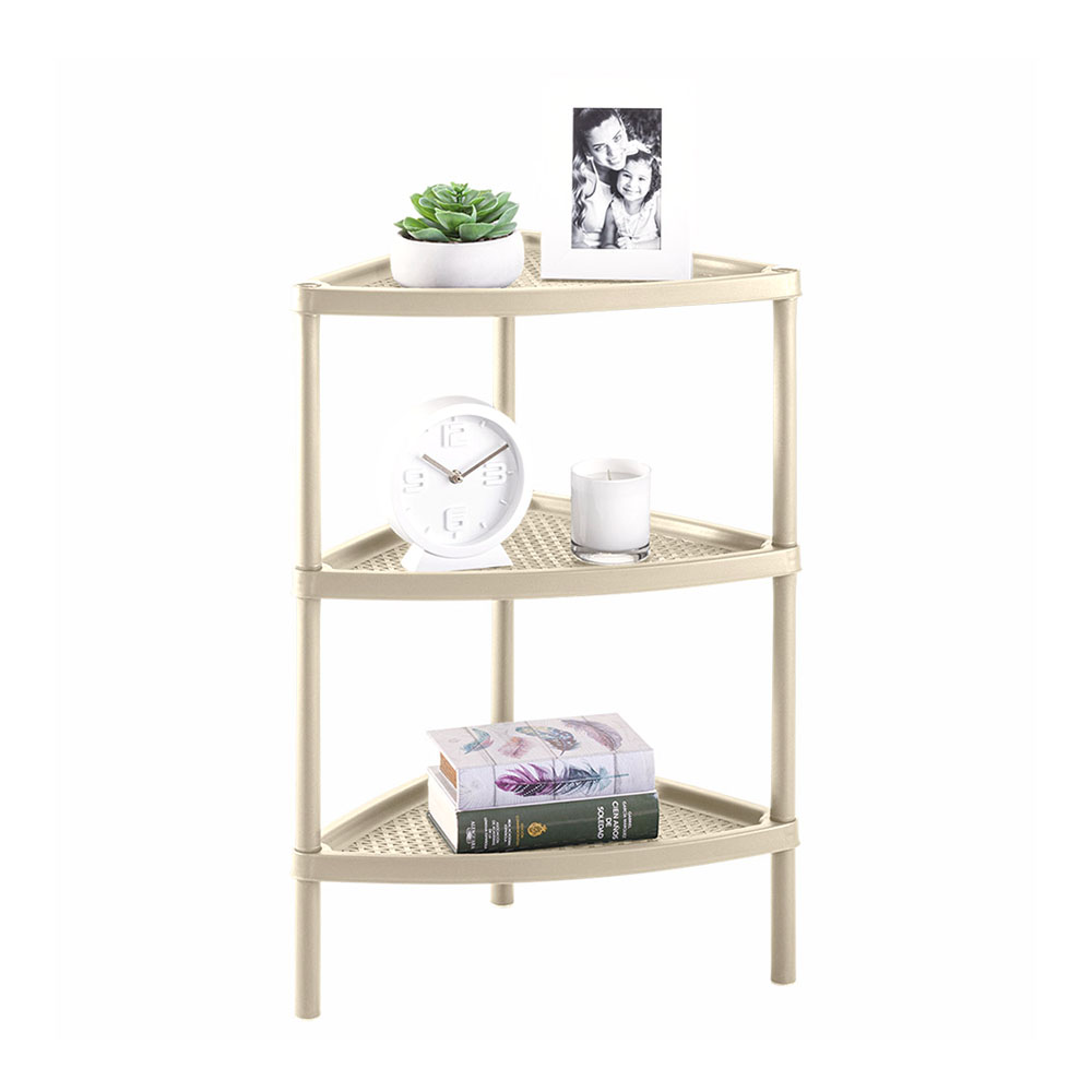 | Características | Mesa multiusos triangular con tejido decorativo y apariencia artesanal. Tres niveles cada uno con una resistencia de 0.5kg. Es fácil de armar y de limpiar. |