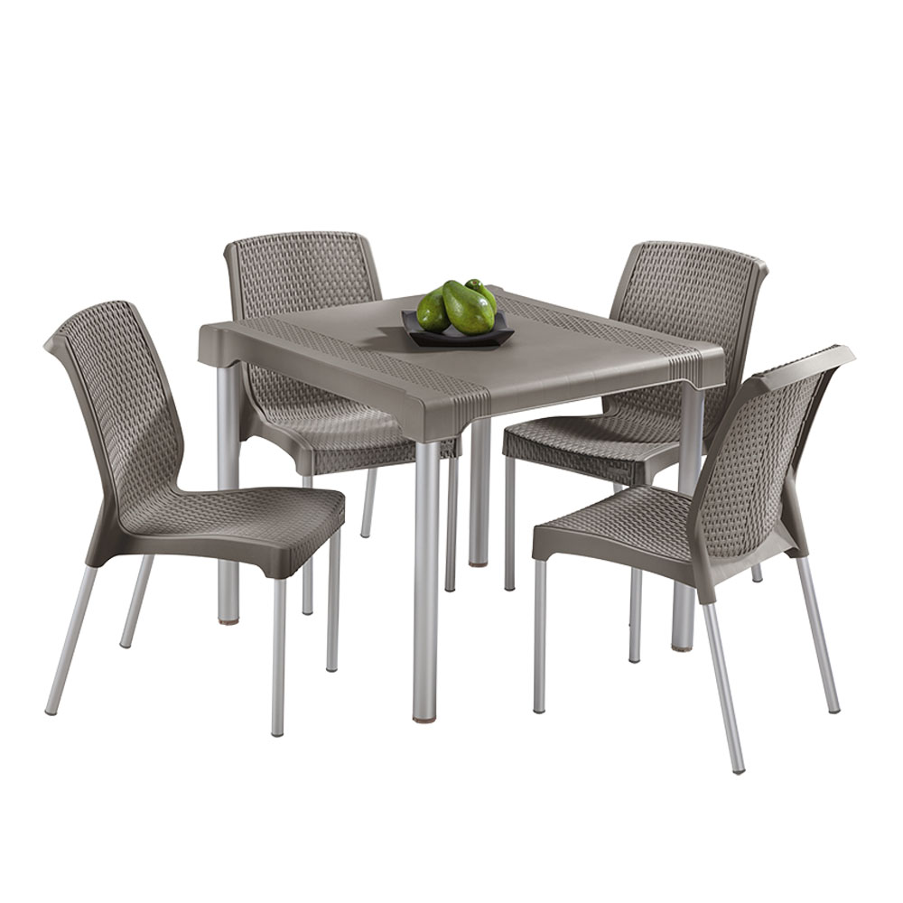 | Características | Mesa SHIA apariencia Rattan, con tejido perforado que imita el tejido artesanal. Exclusiva mezcla de materiales con patas en aluminio que no se oxidan. Cuenta con un tacón nivelador. La mesa es cuadrada con una medida de 85 x 85 cm. Tiene un tapón de centro especial para parasol. Fácil de armar, no requiere herramientas. Fácil de limpiar. |