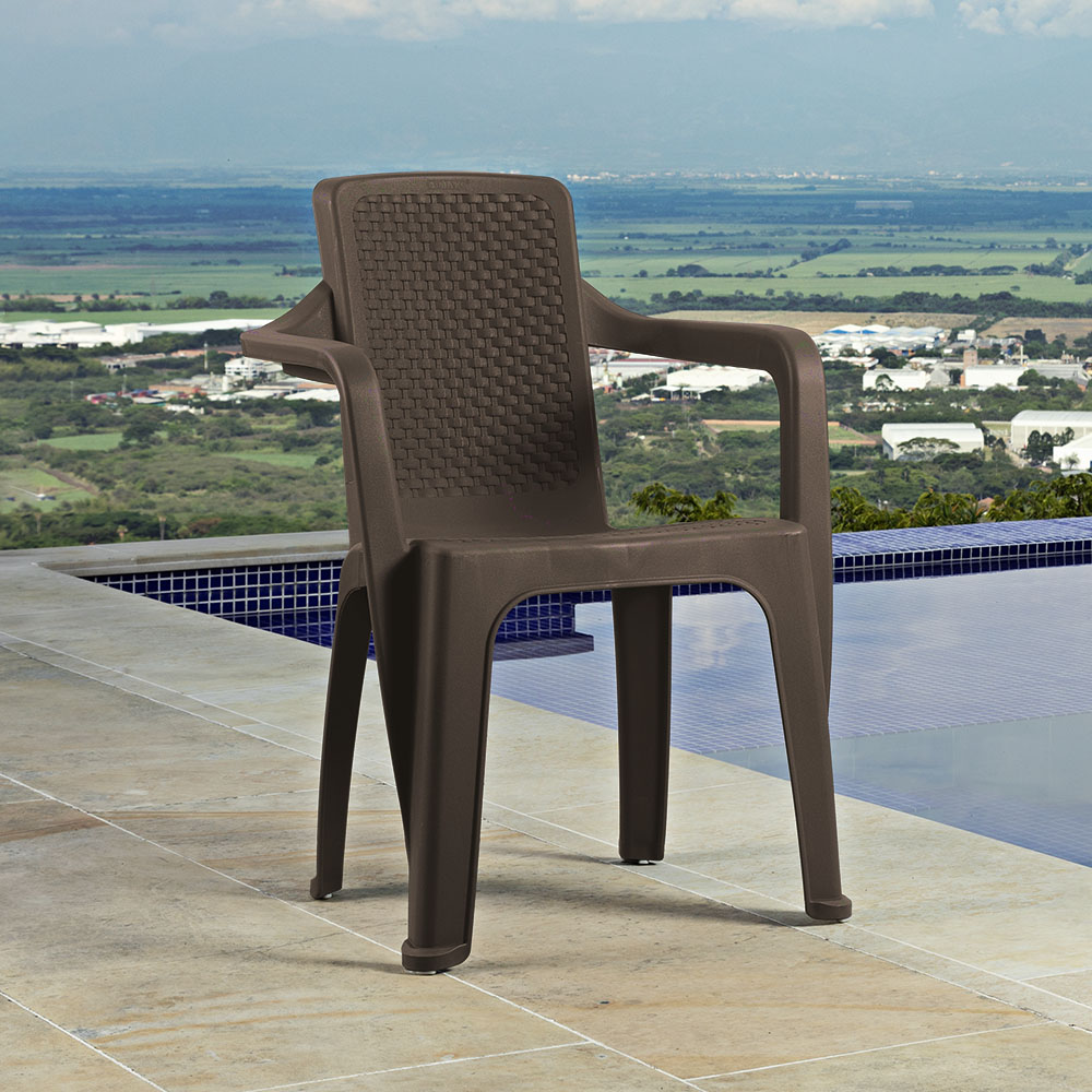 | Características | Silla Eterna con brazos con apariencia Rattan. Incluye tacón antideslizante. Cómoda y ergonómica. Beneficios Fácil de limpiar. Apariencia Rattan. Con tacón antideslizante. Soporta hasta 115kg repartidos de manera uniforme |