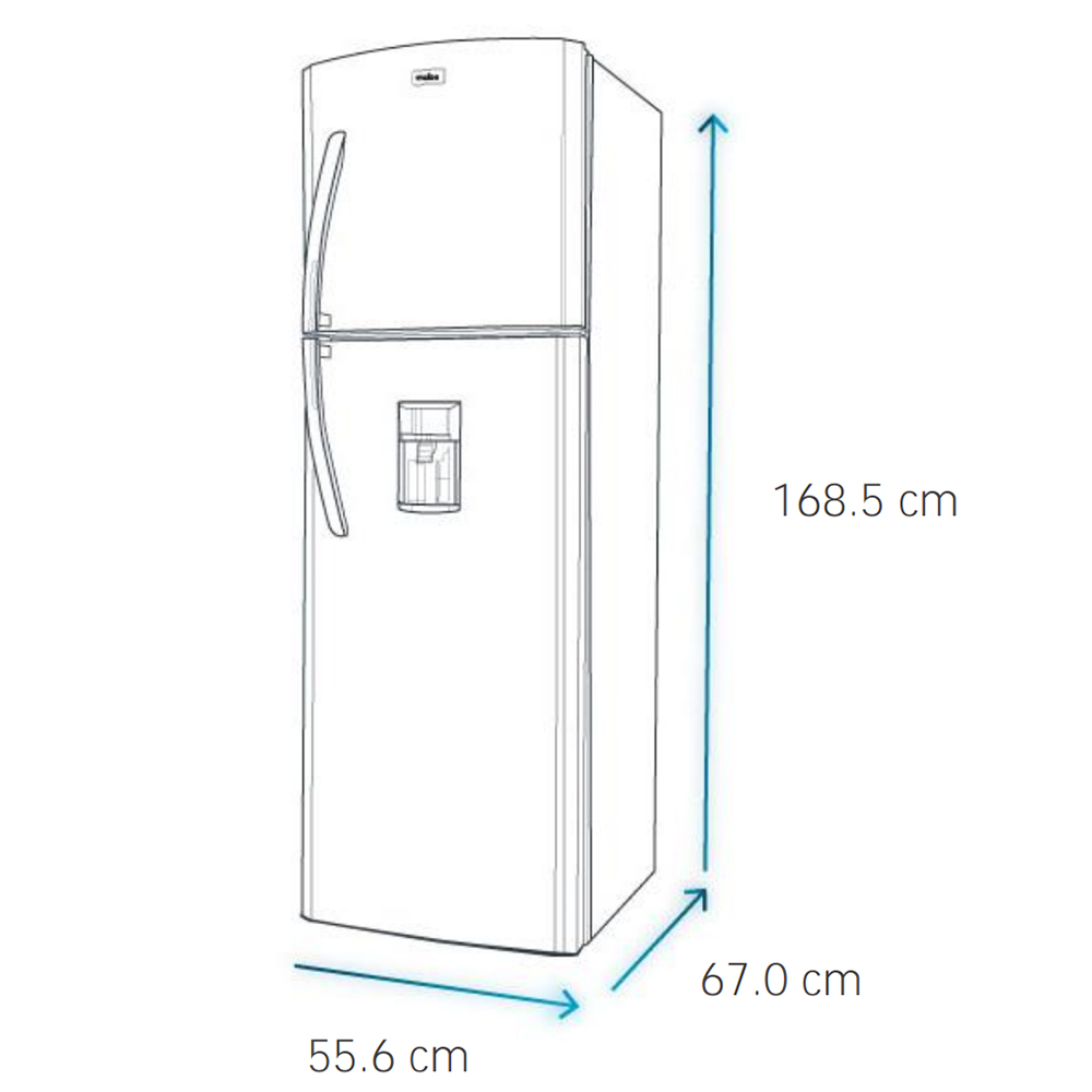| Características | Capacidad: Bruta 267 L | Neta 250 L • Jaladera tipo Full Grip • Gas Refrigerante R600a • Voltaje: 115V / 60Hz En puerta de congelador • 1 anaquel completo •Desmoldador de hielos En interior de congelador • 1 parrilla de alambrón En puerta de enfriador • Despachador de agua 2 L • 2 anaqueles completos • 1 anaquel para botellas • 1 anaquel medio En interior de enfriador • 2 bandejas de cristal templado • Cajón legumbrero con tapa de cristal templado • Cool Zone • Luz interior LED |