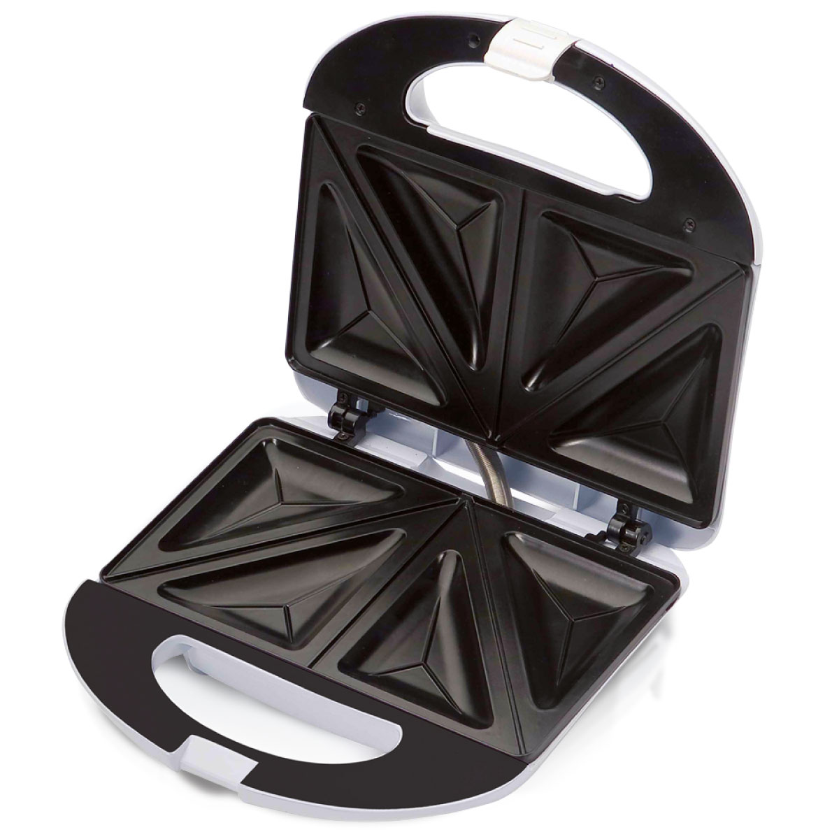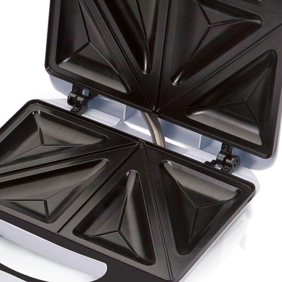 | Características | Apto para contacto con alimentos Almacenamiento vertical Planchas en aluminio antiahderente Luces indicadoras de encendido y preparado Base antideslizante Plancha antiahderente tipo corte triangulo |