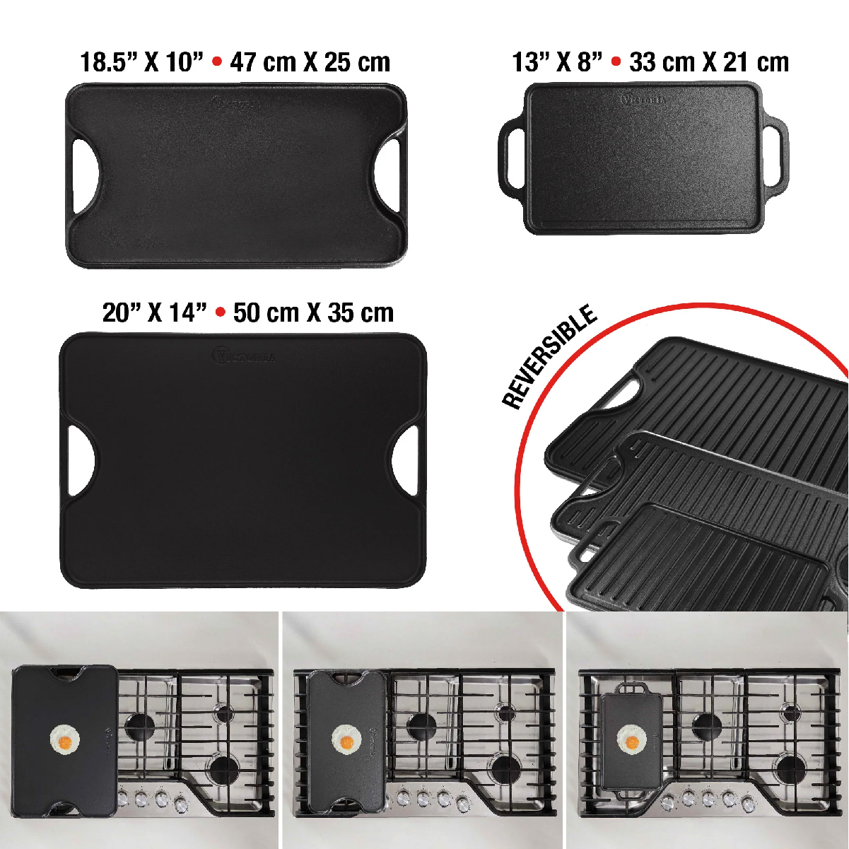 | Marca | Victoria Nuestra plancha de hierro fundido cuenta con una superficie lisa y otra tipo parrilla que te brindará una versatilidad ideal para preparar todo tipo de recetas desde carne hasta vegetales quesos y otros. Descubre los beneficios del hierro fundido como la distribución y retención del calor que permitirá una cocción uniforme de tus alimentos y los mantendrá calientes durante mucho más tiempo. |