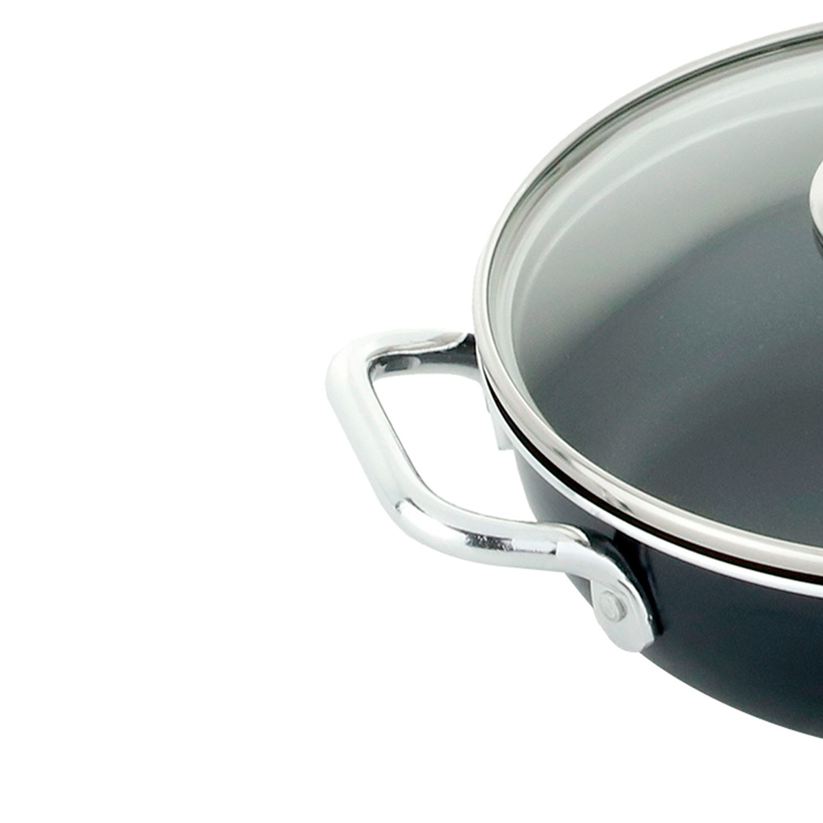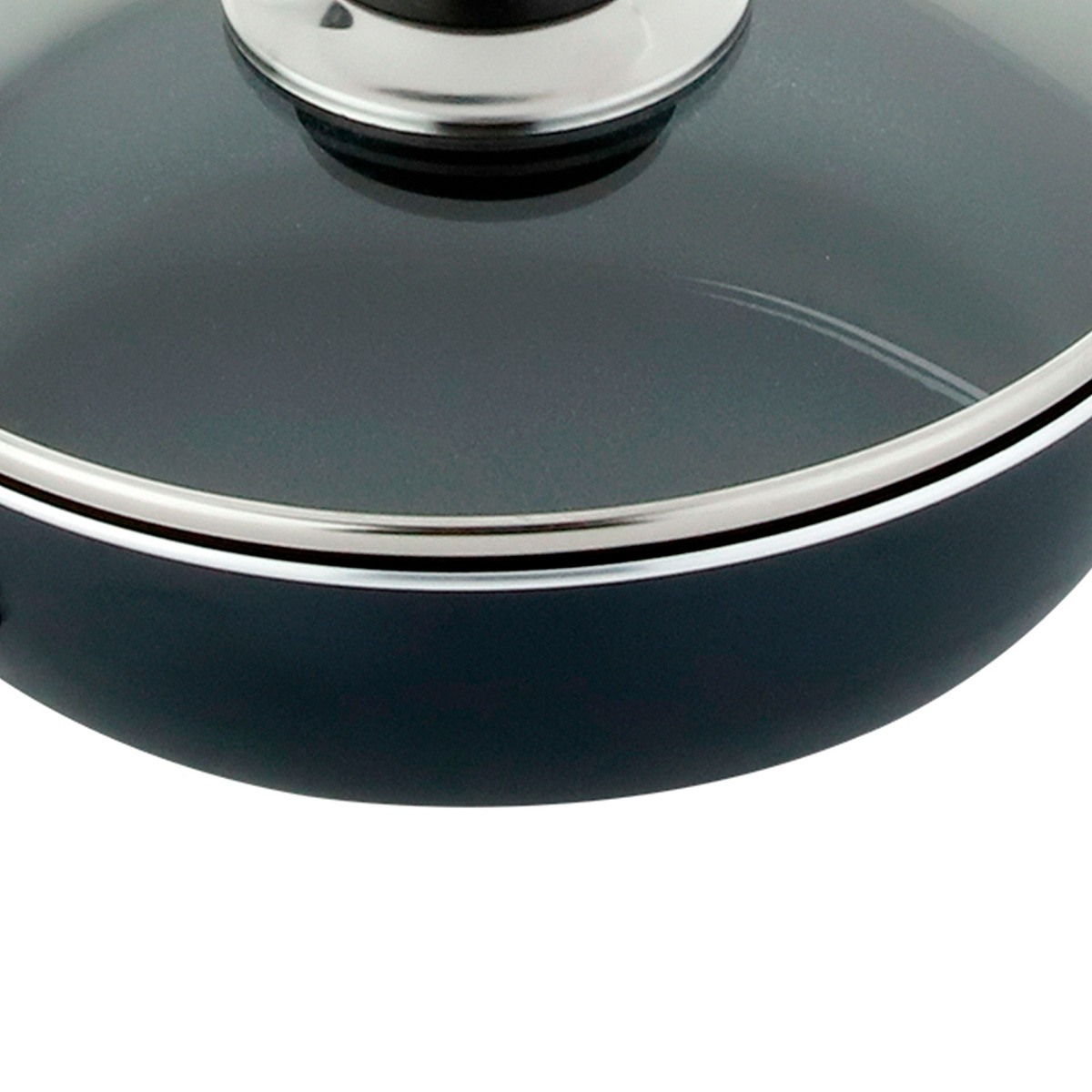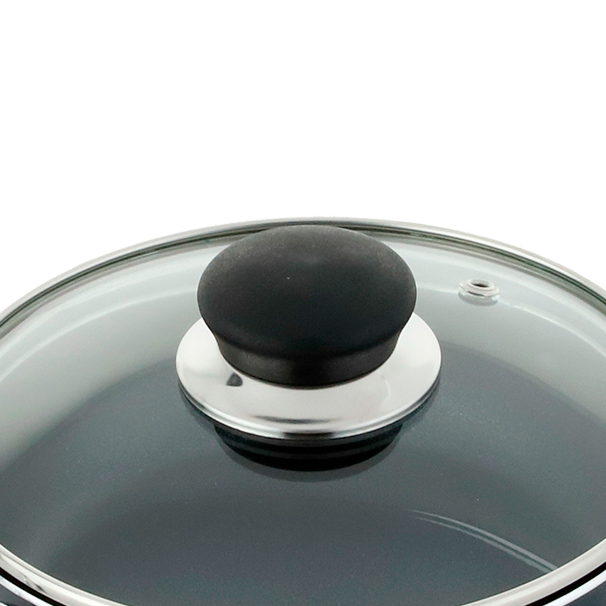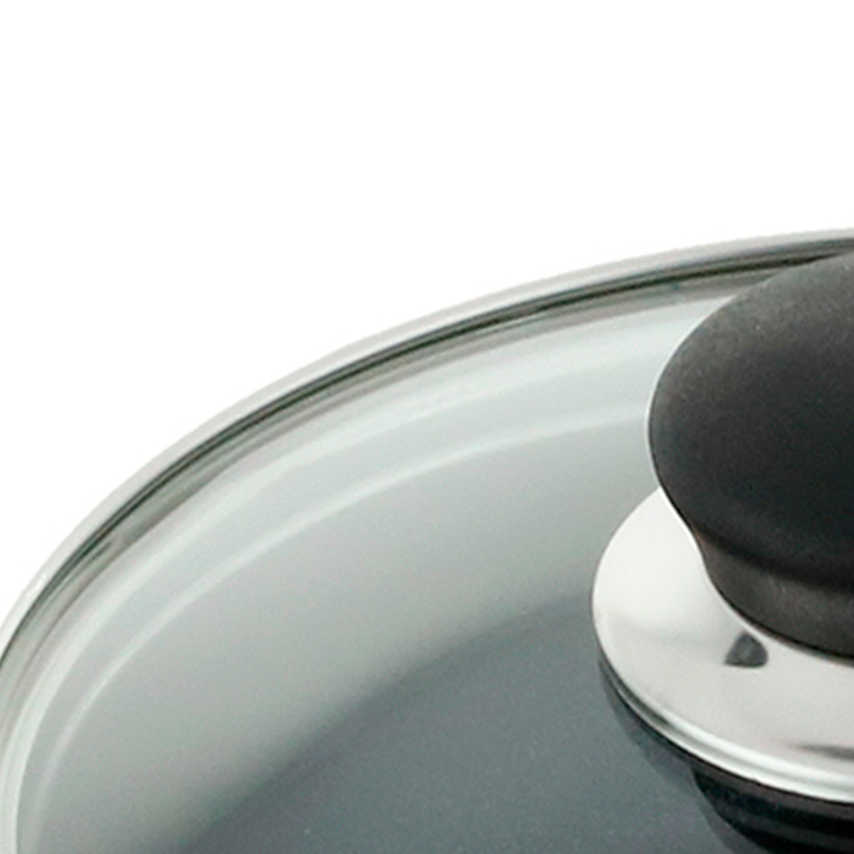 | Características | Apto para contacto con alimentos Incluye tapa de vidrio templado con pomo ergonomico Asas en antiahderente |
